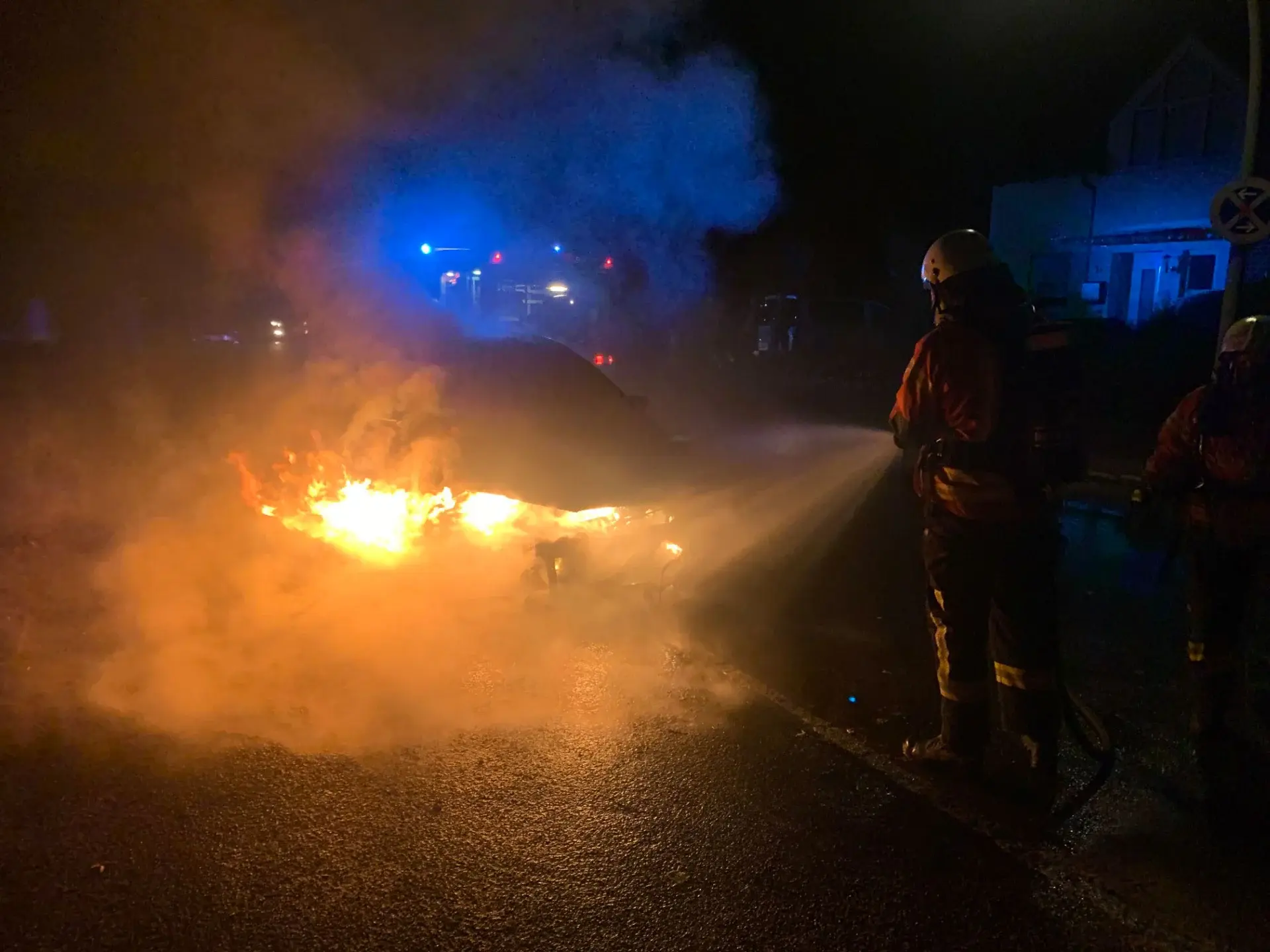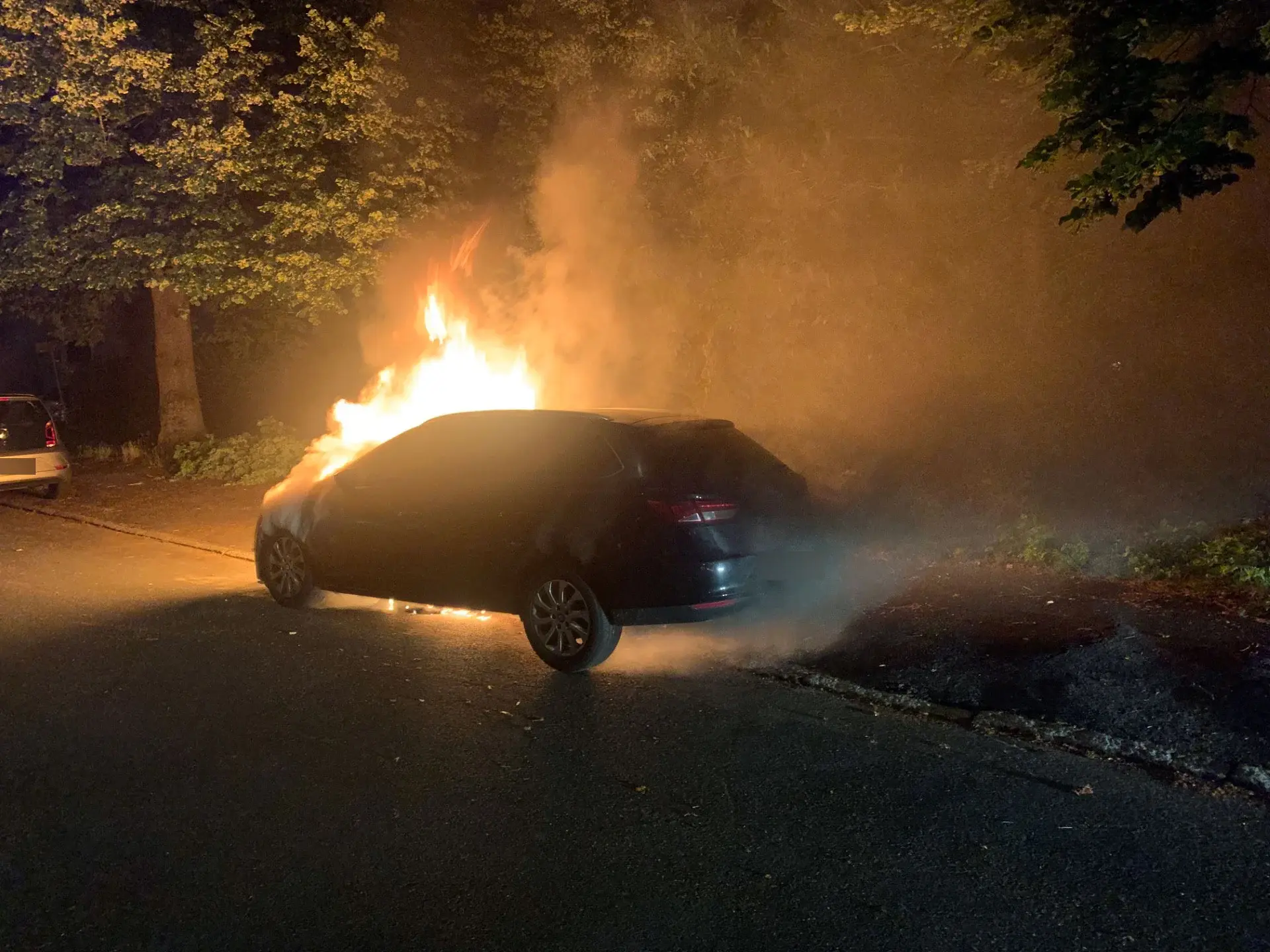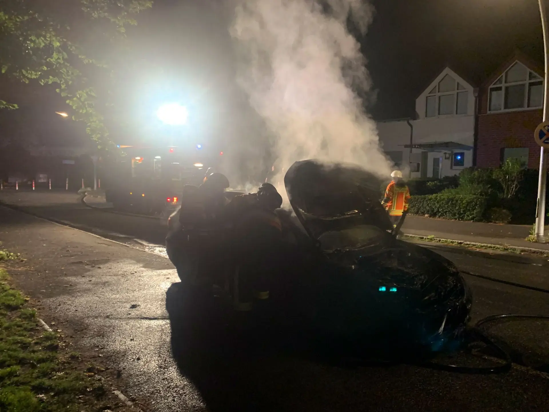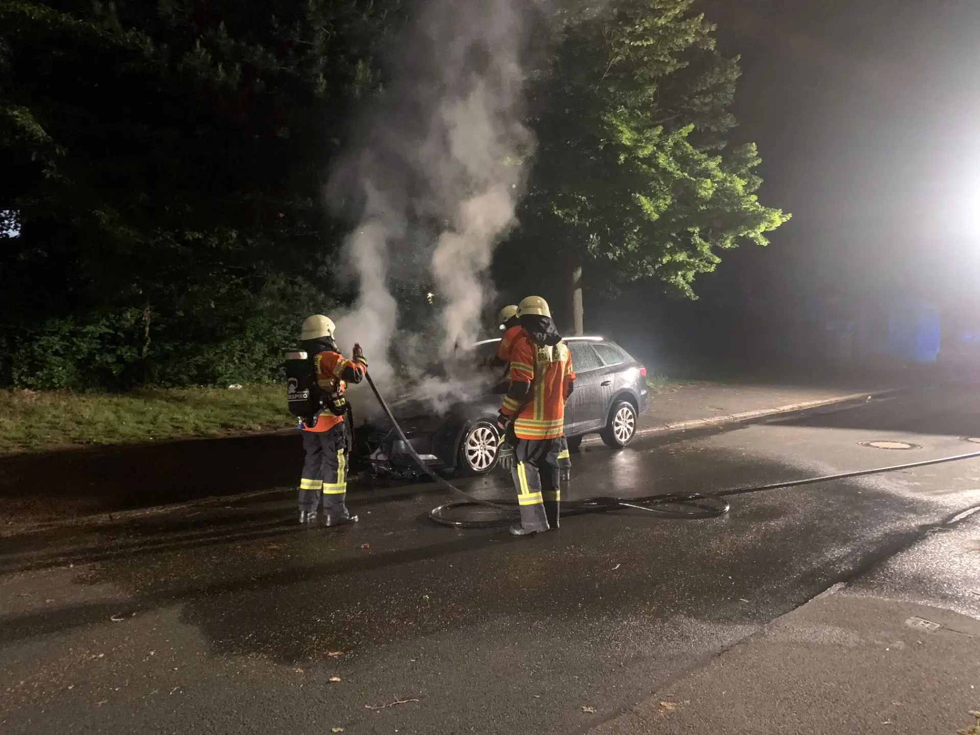 Das Fahrzeug hatte jedoch bereits so viel Feuer gefangen, dass sich die Flammen auch im Innenraum ausgebreitet hatten. Um auch diese Brandherde bekämpfen zu können, musste eine Seitenscheibe des Pkw eingeschlagen werden. Die Einsatzkräfte konnten den Brandherd im Inneren des Fahrzeugs letztendlich erfolgreich löschen. Hierbei wurde auch eine Wärmebildkamera eingesetzt, um die letzten Glutnester zu entdecken.