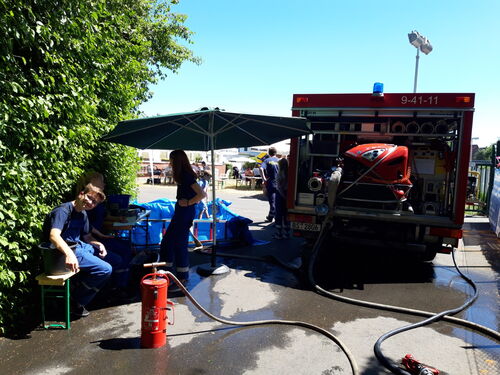 Zeitgleich feierte der Ölpersee sein 40. Jubiläum und auch hier waren wir natürlich mit von der Partie. Bei herrlichem Wetter fuhr die zweite Gruppe am späten Mittag zum Ölpersee und baute dort die Spritzwand und Pylonen mit Tennisbällen auf. Viele Kinder versuchten sich an der Kübelspritze um die Fenster und Türen der Spritzwand zu öffnen. Zudem galt es mit der Kübelspritze die Tennisbälle von den Pylonen zu spritzen. Viele Besucher nutzen auch die Chance, sich unser TSF-W mal genauer anzusehen.