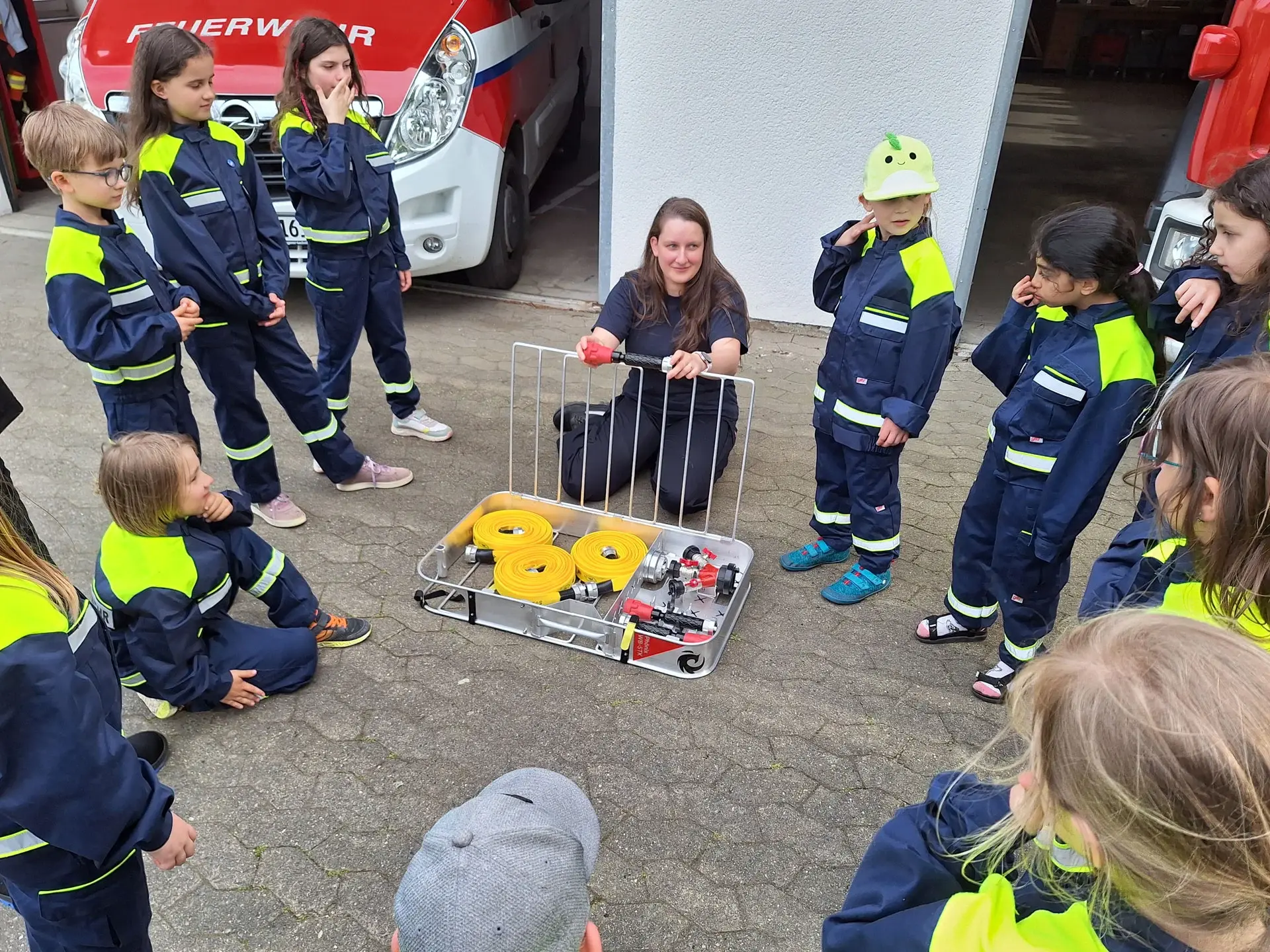 Das kindergerechte Löschangriffset bietet erleichterte, spielerische Zugänge zur Brandschutzerziehung und soll die Kinder an den verantwortungsbewussten Umgang mit der Feuerwehrausrüstung heranführen. Die speziell konzipierten Armaturen sind so leicht, dass sie von den Kindern ohne Probleme getragen und bedient werden können. Beim praktischen Teil der Veranstaltung wurde das neue Set mit echtem Wasser getestet – allerdings mit einem Druck in der Stärke eines gewöhnlichen Wasserhahns, um jegliche Gefahren auszuschließen. Auch hierbei standen den Kindern erfahrene Betreuer zur Seite, um Sicherheit zu gewährleisten und technisches Wissen weiterzugeben.